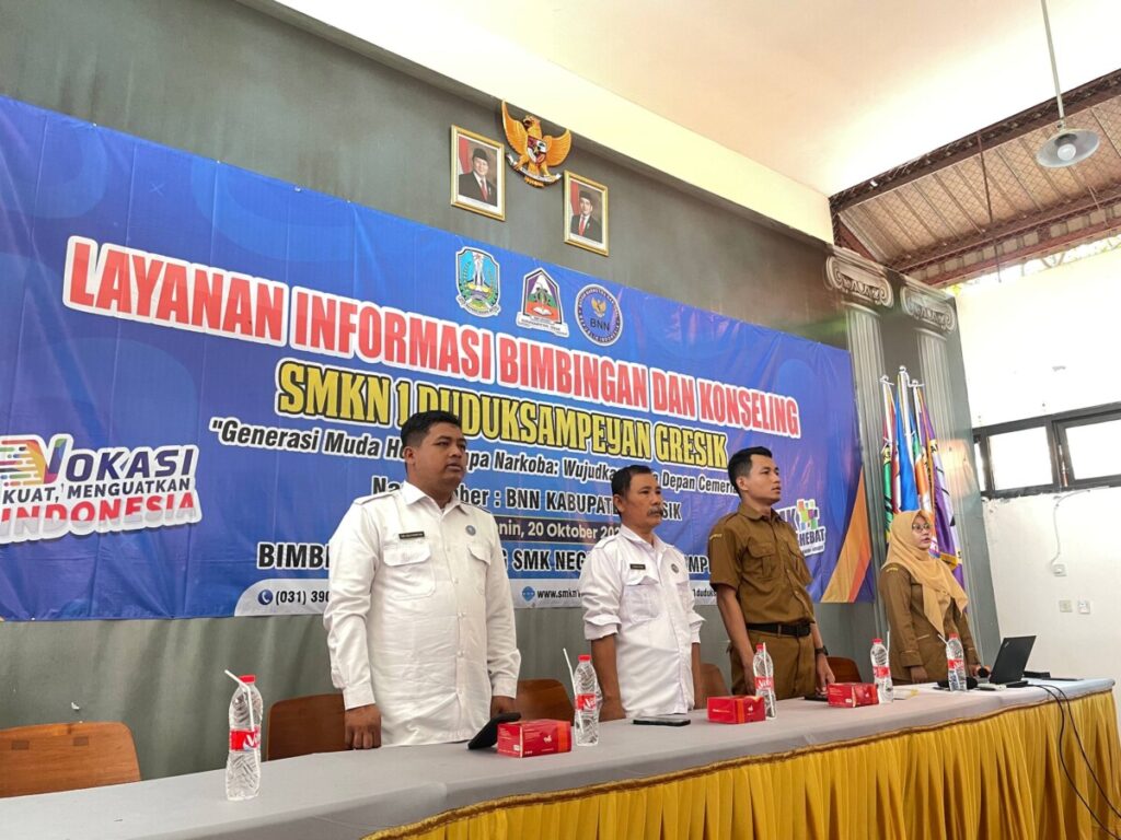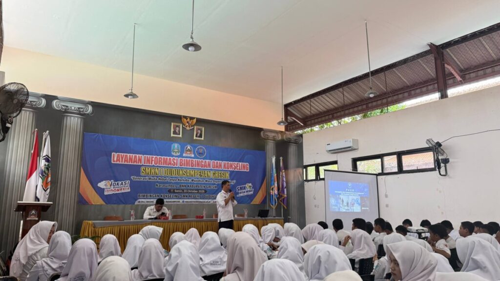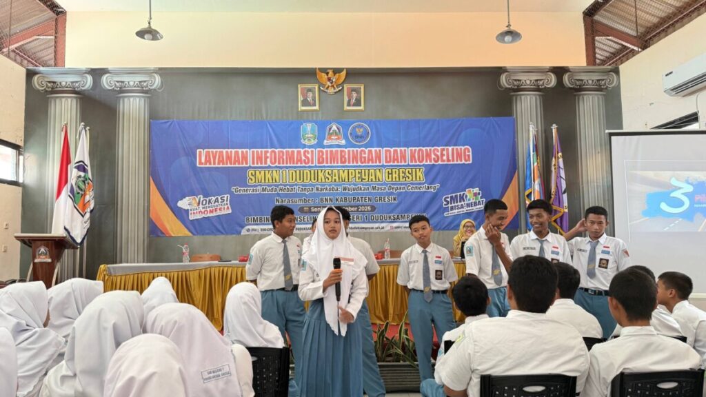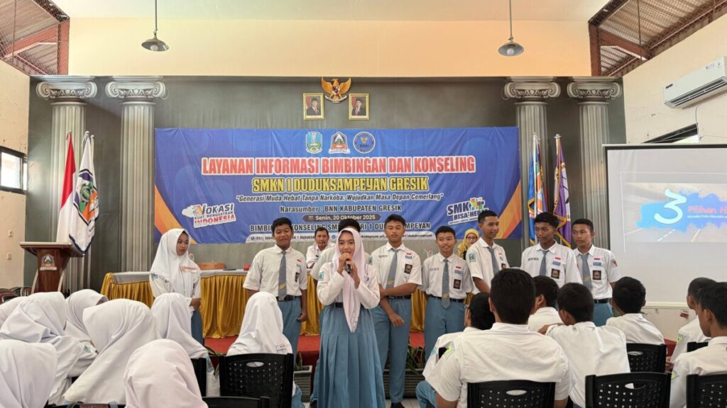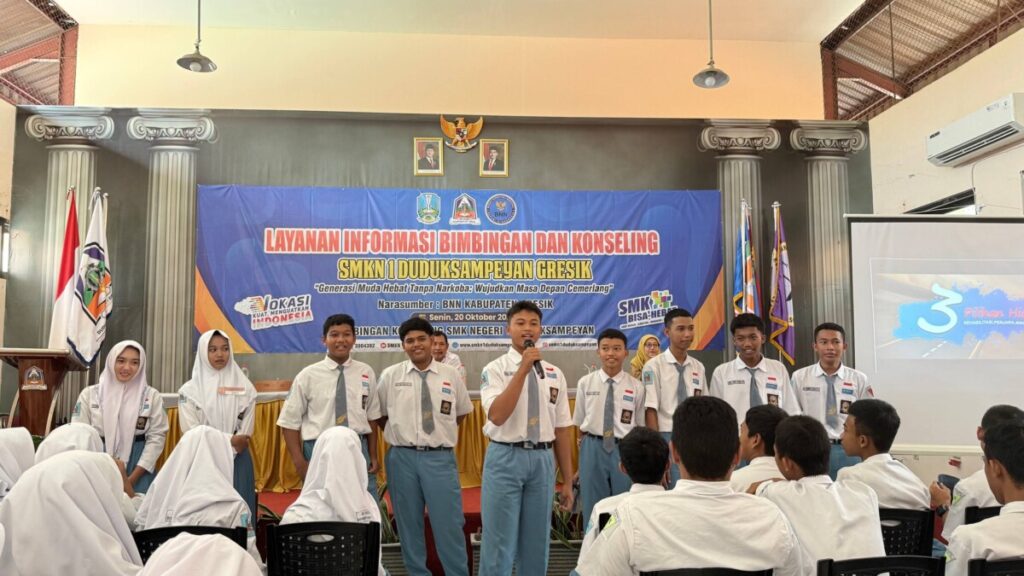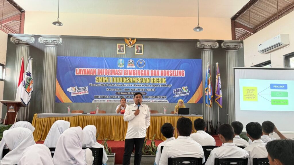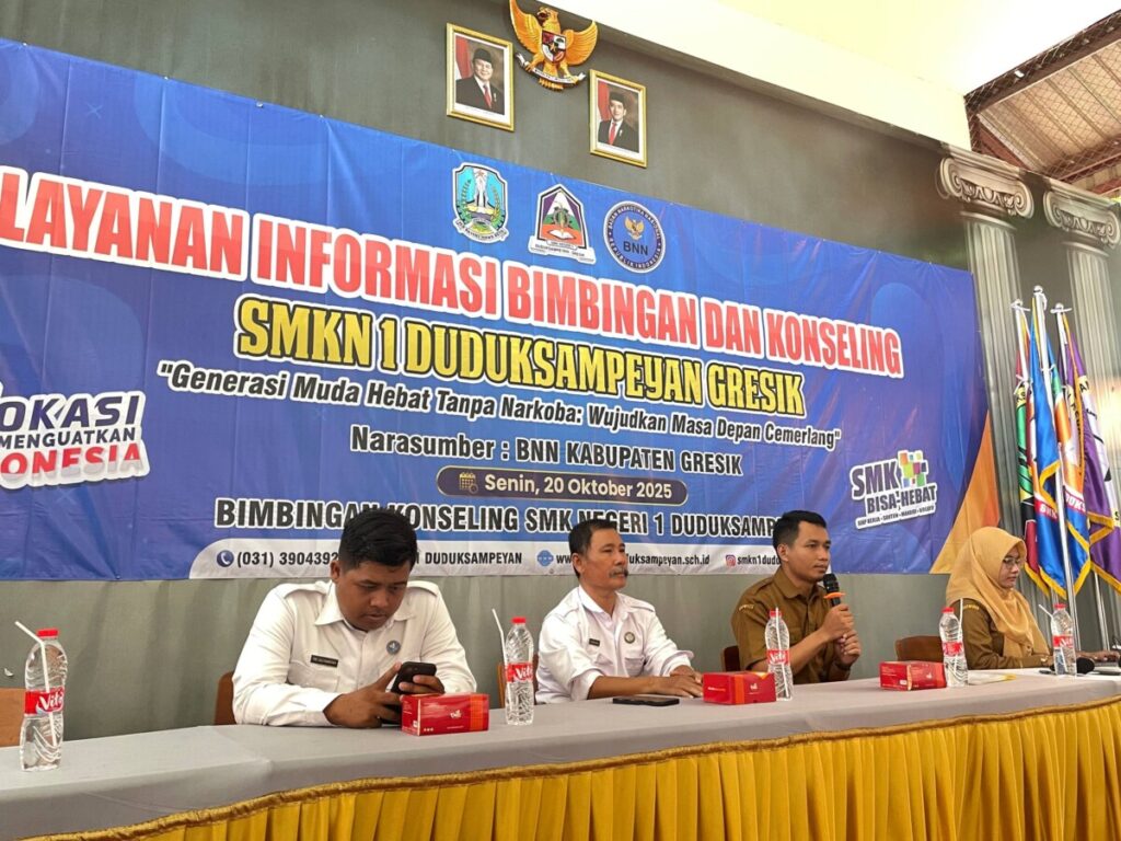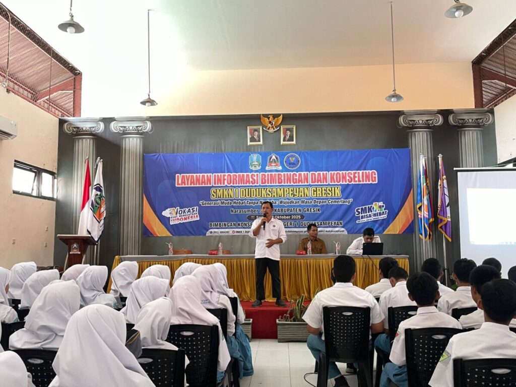 Pada hari Senin, 20 Oktober 2025, SMKN 1 Duduksampeyan menggelar kegiatan Layanan Informasi Bimbingan dan Konseling dengan tema “Generasi Muda Hebat Tanpa Narkoba: Wujudkan Masa Depan Gemilang”. Kegiatan ini diikuti oleh seluruh siswa kelas X dan menghadirkan narasumber dari BNN Kabupaten Gresik.