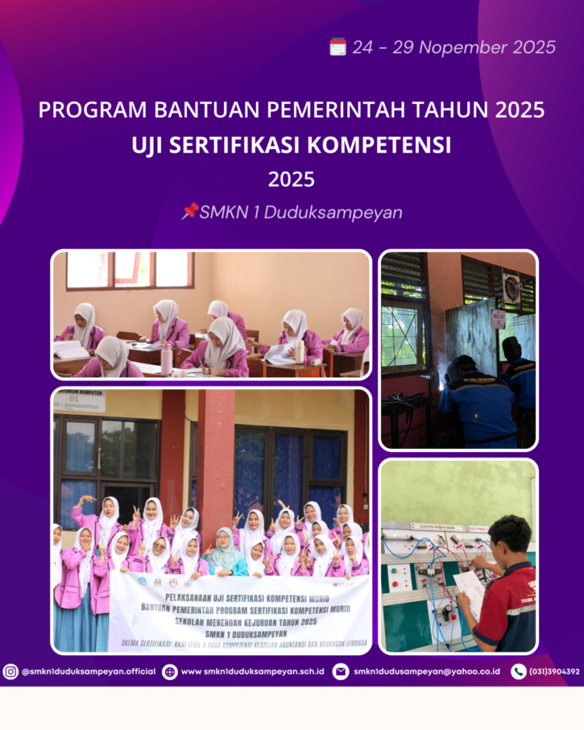 SMKN 1 Duduksampeyan melaksanakan Uji Sertifikasi Kompetensi Murid melalui Program Bantuan Pemerintah Sertifikasi Kompetensi SMK Tahun 2025 sebagai bentuk komitmen dalam meningkatkan kualitas dan daya saing lulusan agar selaras dengan kebutuhan dunia industri.