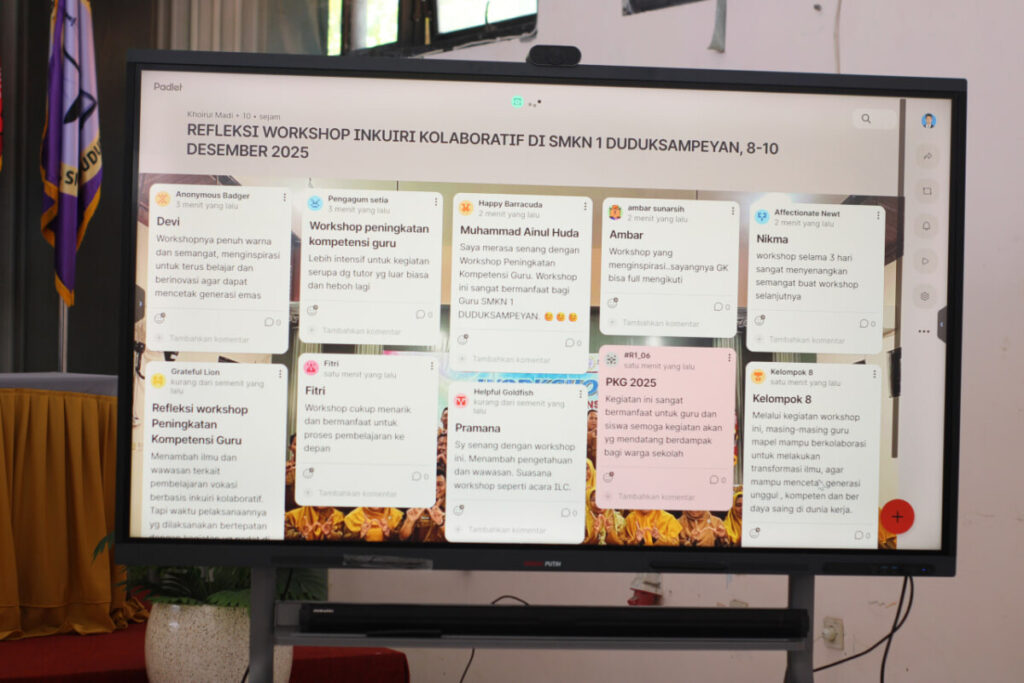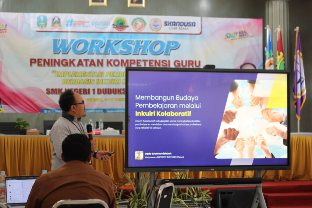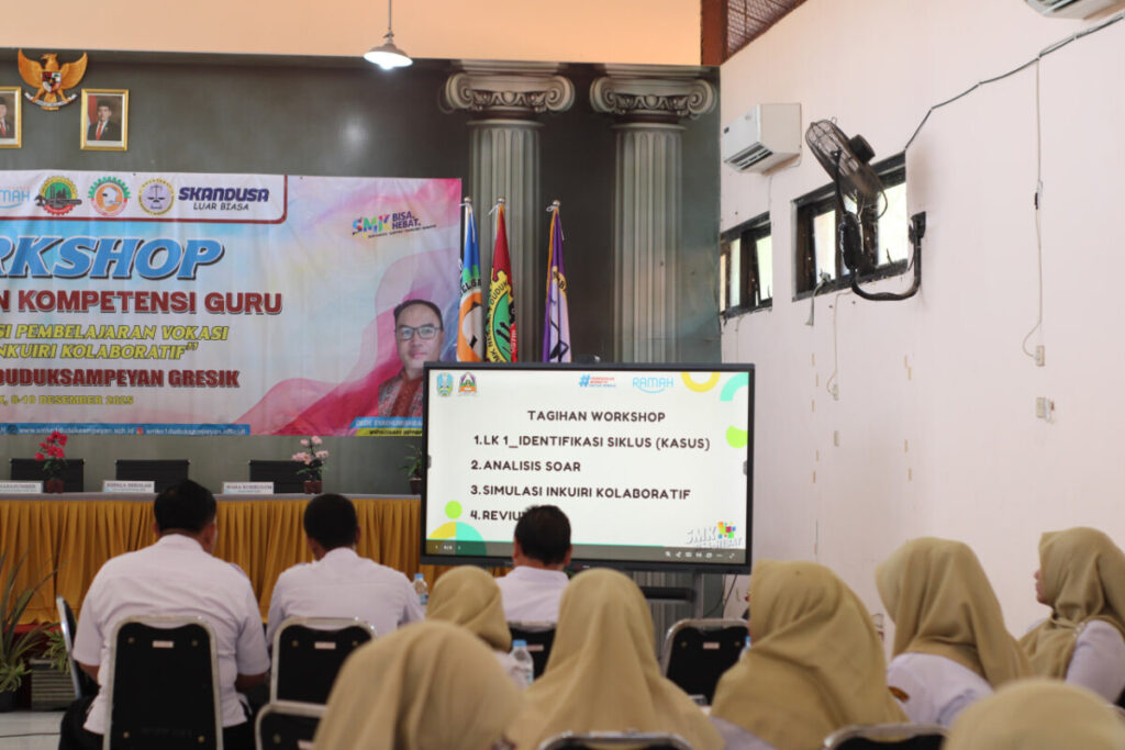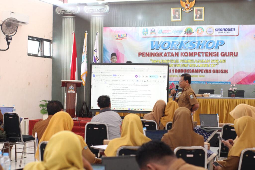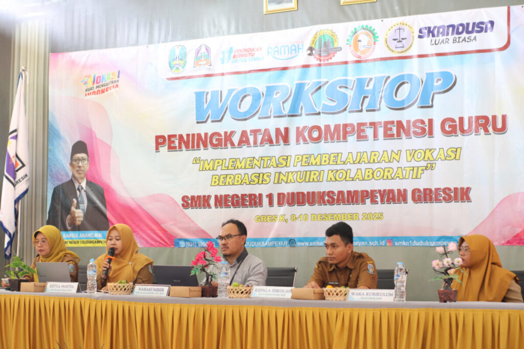 SMKN 1 Duduksampeyan terus berkomitmen meningkatkan kualitas pembelajaran vokasi yang selaras dengan perkembangan dunia kerja melalui penyelenggaraan Workshop Peningkatan Kompetensi Guru bertema “Implementasi Pembelajaran Vokasi Berbasis Inkuiri Kolaboratif.” Kegiatan ini dilaksanakan selama tiga hari, pada tanggal 8–10 Desember 2025, dan diikuti oleh seluruh bapak dan ibu guru SMKN 1 Duduksampeyan.