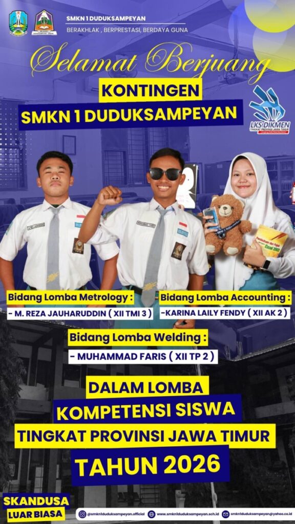 Selamat bertanding dan berkompetisi kepada siswa-siswi SMKN 1 Duduksampeyan. Semoga dapat memberikan hasil terbaik, mengharumkan nama sekolah, serta membawa prestasi gemilang bagi Kabupaten Gresik.