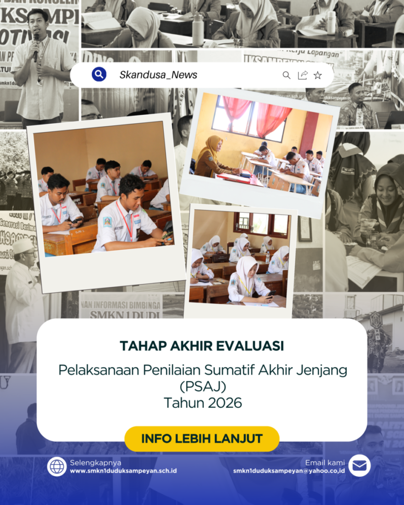 SKANEWS, GRESIK – SMKN 1 Duduksampeyan melaksanakan kegiatan Penilaian Sumatif Akhir Jenjang (PSAJ) bagi peserta didik kelas XII pada tanggal 6–10 April 2026. Kegiatan ini merupakan salah satu tahapan penting dalam proses evaluasi akhir pembelajaran bagi siswa sebelum dinyatakan lulus dari satuan pendidikan.