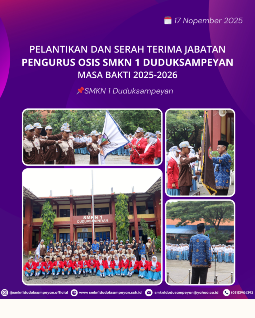 Pada hari Senin, 17 November 2025, SMKN 1 Duduksampeyan melaksanakan Upacara Pelantikan dan Serah Terima Jabatan (Sertijab) Pengurus OSIS Masa Bakti 2025–2026. Upacara berlangsung khidmat di halaman sekolah dan dipimpin langsung oleh Kepala SMKN 1 Duduksampeyan, Drs. Samsul Anang, M. Read More …