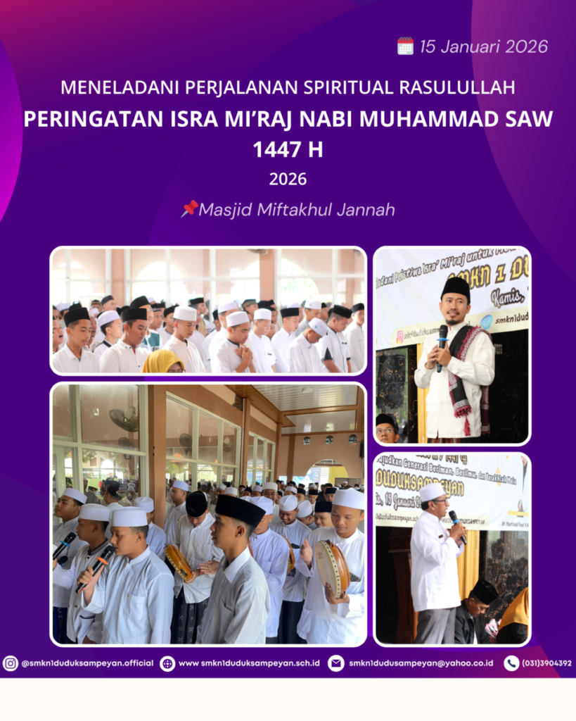 Dalam rangka memperingati peristiwa agung Isra Mi’raj Nabi Muhammad SAW 1447 H. Kamis, 15 Januari 2025, keluarga besar SMKN 1 Duduksampeyan menyelenggarakan kegiatan keagamaan dengan tema : “Meneladani Peristiwa Isra Mi’raj untuk Mewujudkan Generasi Beriman, Berilmu, dan Berakhlak Mulia.” Kegiatan Read More …