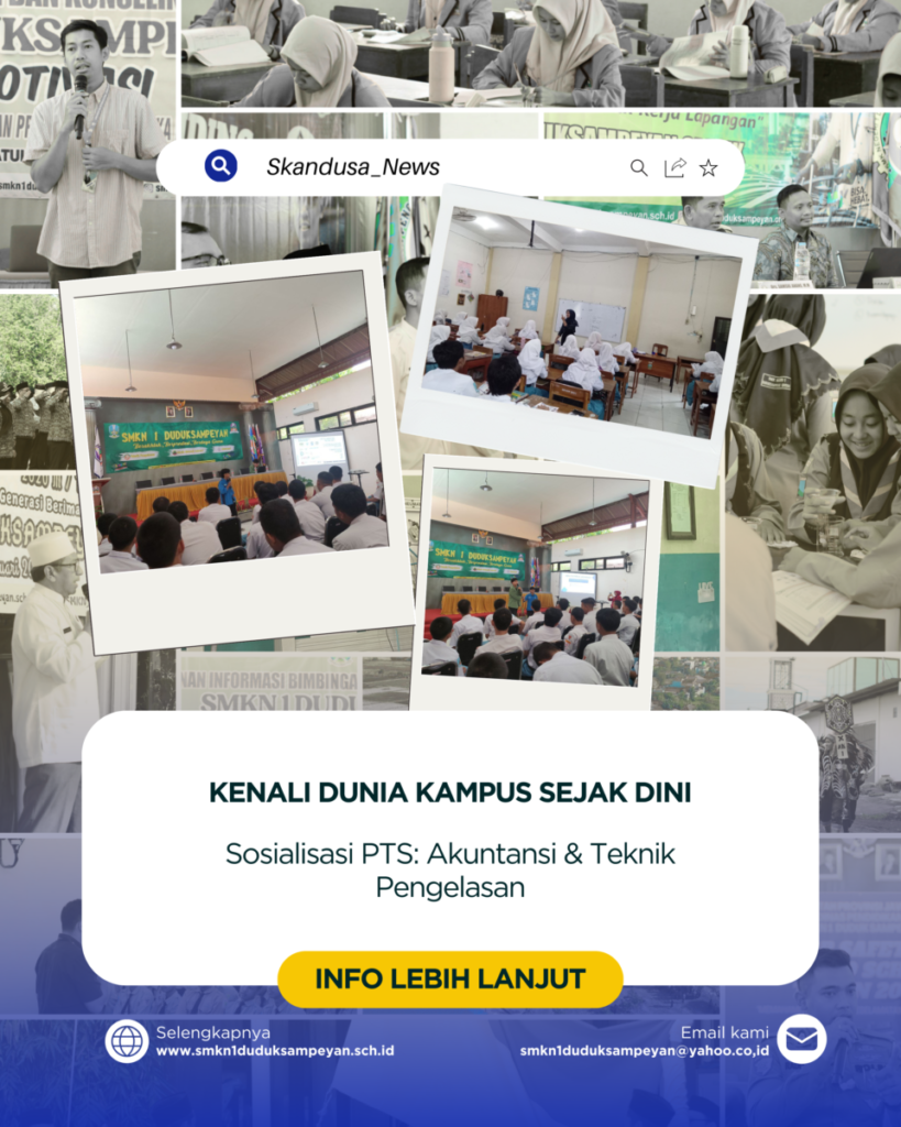 SKANEWS, GRESIK – SMKN 1 Duduksampeyan melaksanakan kegiatan Sosialisasi Perguruan Tinggi bagi peserta didik Program Studi Teknik Pengelasan dan Akuntansi pada Selasa, 20 Januari 2025. Kegiatan ini berlangsung di Aula dan beberapa ruang kelas SMKN 1 Duduksampeyan. Gambar 1. Sosialisasi Read More …